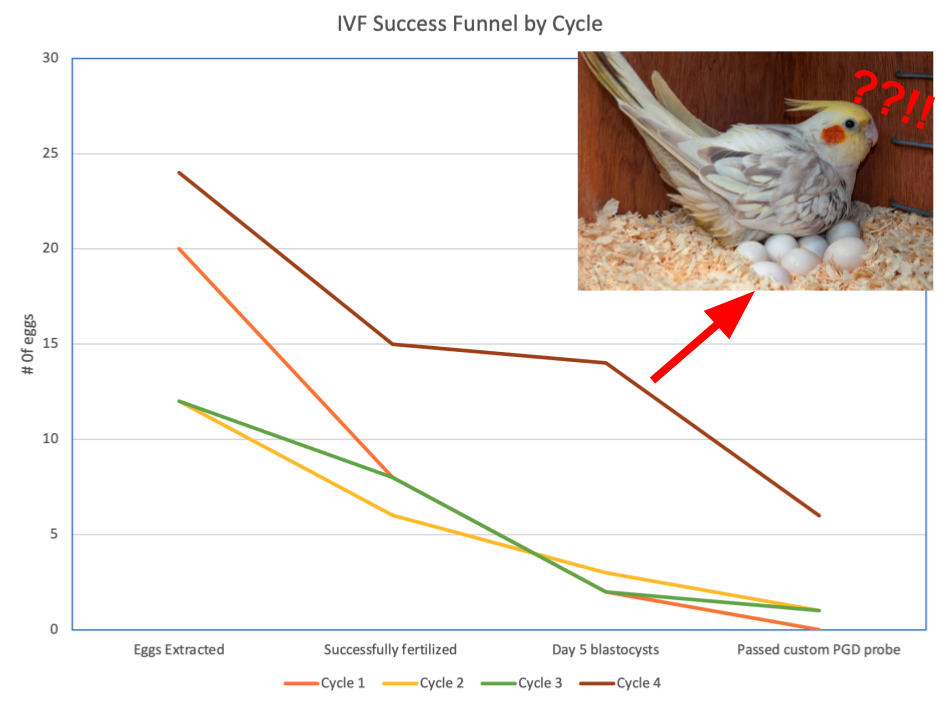 In our case, we also had a lot of dropoff at the final stage (custom preimplantation genetic diagnosis probe) as we weren’t just doing the normal screening for trisomies and deleted chromosomes, but were also doing some specific genetic tests.