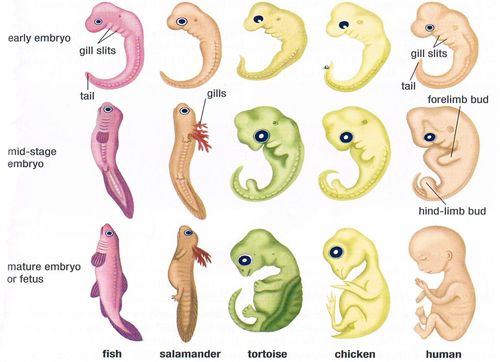 Over the next few weeks, the embryo will hopefully grow rapidly and start to map out a body plan, first establishing a head and a tail, then creating a neural tube, then starting to create organs and limbs. It's fascinating to look at how similar early development is across species. Nature figured out a way of bootstrapping a body layout with toolkit genes, and then made relatively few modifications to these first steps, instead adding additional later steps to direct development into the final form for each species. As a result, early body layouts look similar whether the embryo is a fish, frog, mouse, or human. Differentiation into something recognizably human doesn't happen until a couple of months in.