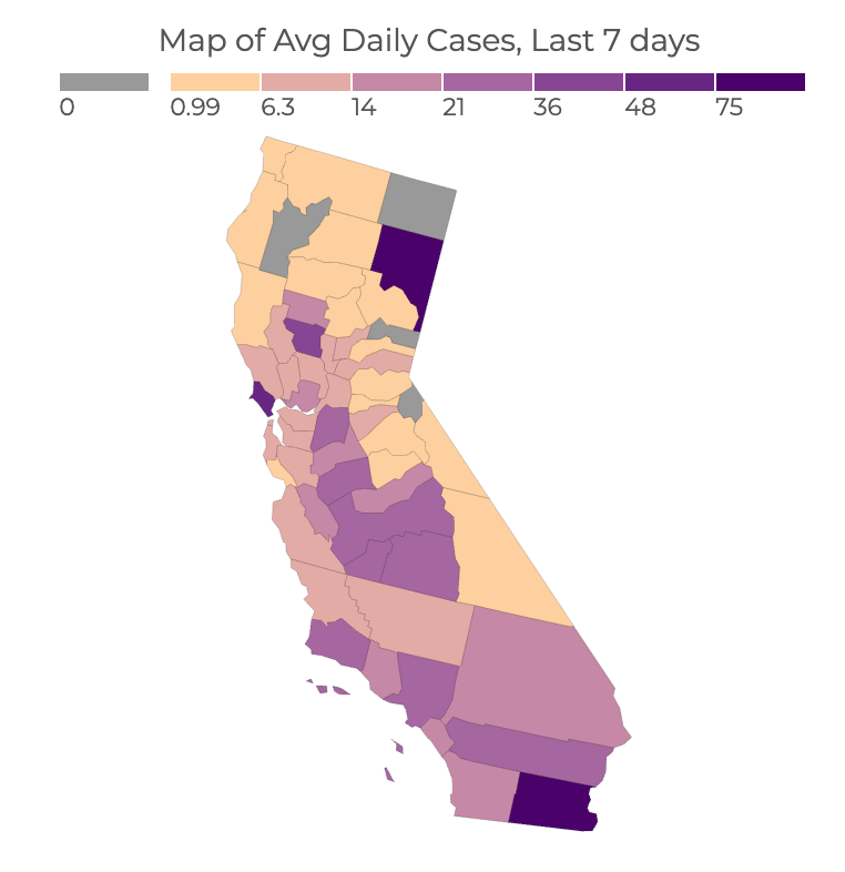 One thing to consider when choosing destinations is the current level of COVID cases in the area you’re traveling to. Some areas have literally 100x the caseload of others. You can use this map and zoom in on whatever states you’re traveling to to see results at the county level. Make sure to select “last 7 days” to get a sense of how many people are likely currently infected, and “per 100k” to have a sense of per capita risk. Lassen County (the purple area in the upper right) had 500 cases per 100,000 residents in the last week, which means that roughly one in every 200 people has a known recent case of COVID, and even if those people are staying home, there’s probably an equivalent number walking around presymptomatic and contagious. Buying groceries at Safeway there? Statistically speaking, someone in the building probably has it.